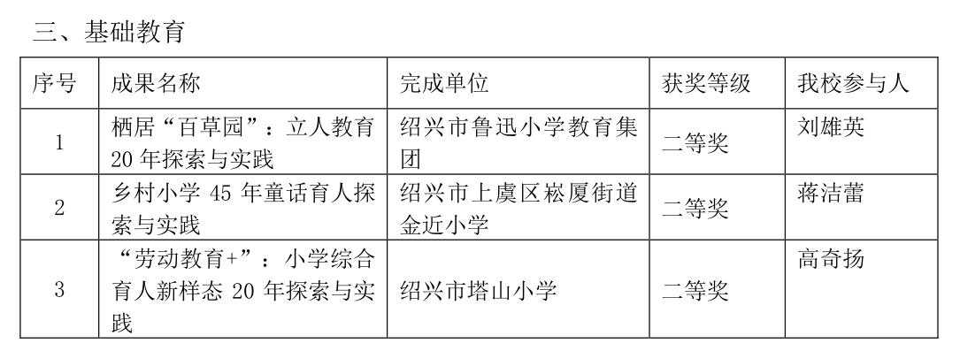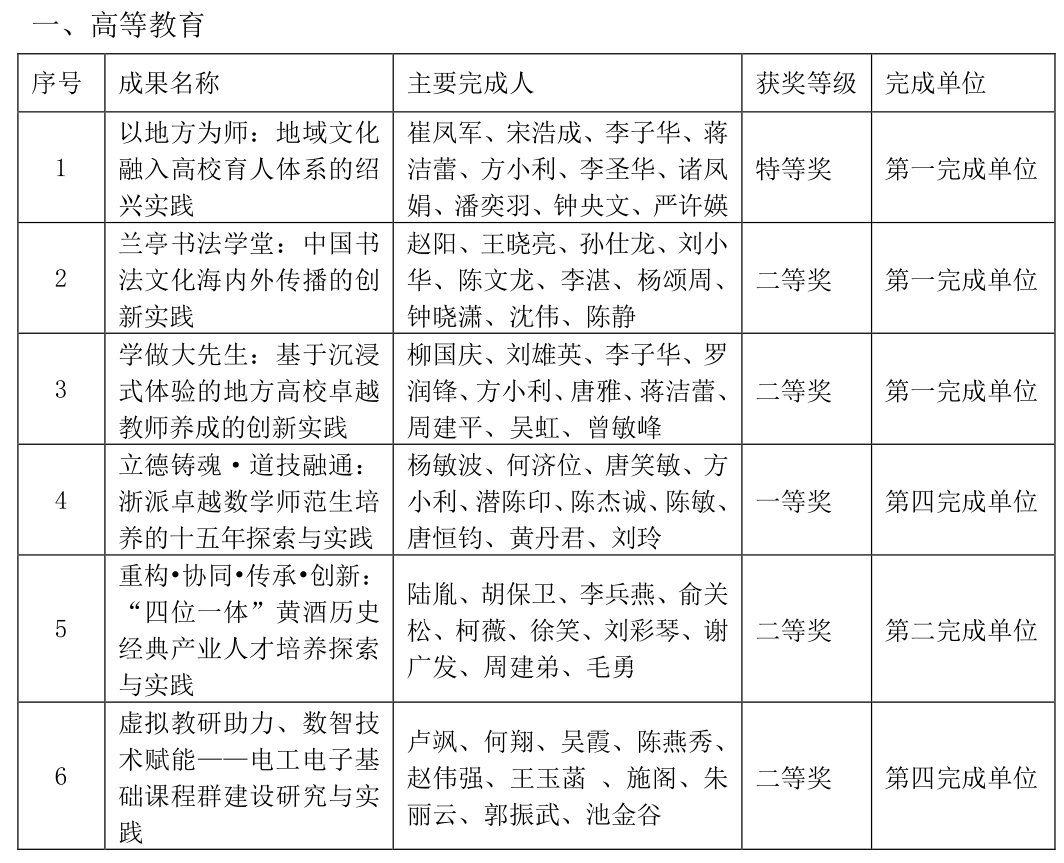 作为主持单位的特等奖项目《以地方为师:地域文化融入高校育人体系的绍兴实践》,针对目前高校地域文化育人普遍面临“资源沉睡难活化、课程零散难深化、成效模糊难量化”三大共性难题,创新性构建“基因解码—生态重构—协同共生”育人新范式。主持的二等奖项目《兰亭书法学堂:中国书法文化海内外传播的创新实践》,依托全国首个书法学本科专业和教育部首批中华优秀传统文化传承基地,构建了“以美育人·通识筑基—以文化人·活态传薪—以艺通心·文明互鉴”创新体系,为落实“两创”方针提供可复制的“兰亭模式”。主持的二等奖项目《学做大先生:基于沉浸式体验的地方高校卓越教师养成的创新实践》,形成了以学做大先生为引领,以师德、师能和教师气质养成为目标,以沉浸式体验为基本路径,以五阶师德教育、模拟教研、文化浸润为特色策略的地方高校师范生培养“养成教育”模式。