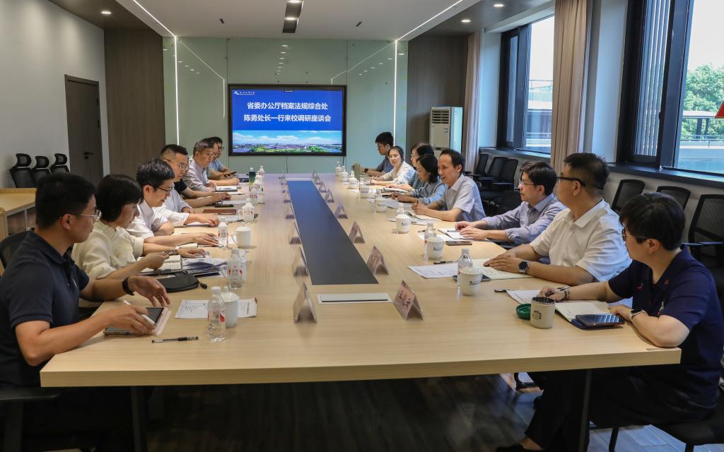 为做好浙江省档案事业“十五五”发展规划编制工作,6月3日下午,浙江省委办公厅档案法规综合处处长陈勇一行来校调研“人工智能+档案”学科建设、档案专业技术人员继续教育培训工作等情况,绍兴市委副秘书长、档案局局长叶根陪同调研,副校长胡云进陪同交流。