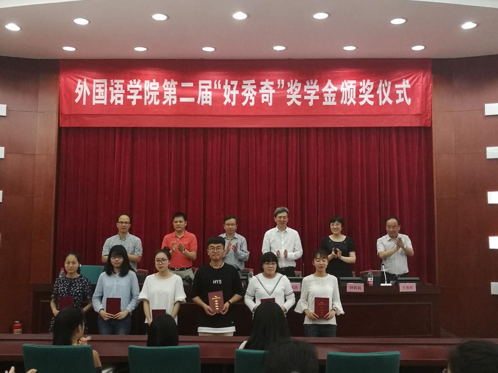 5月25日下午,外国语学院第二届“好秀奇”奖学金颁奖仪式在南山7号楼报告厅顺利举行。副校长杨大明,秀奇实业(香港)有限公司执行董事、广深港校友会会长、英语89届校友石国洪,广深港校友会名誉会长钟光明,对外联络处处长(教育基金会秘书长)、外国语学院以及相关部处和学院代表出席会议。第二届“好秀奇”奖学金获得者以及学院200名师生代表出席颁奖仪式。