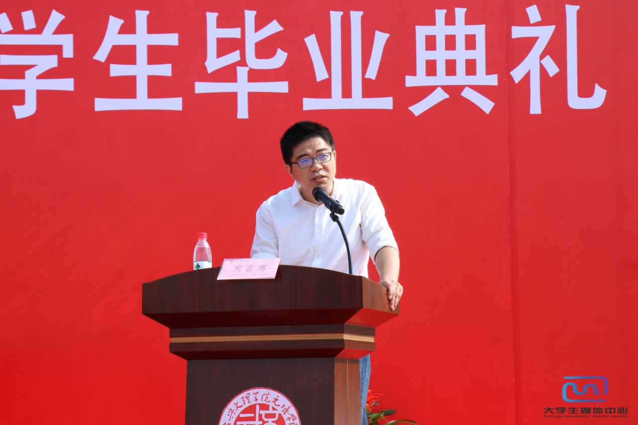 教师代表公共基础教育分院刘伟老师回顾了自己与元培学院结缘的动人过往,回忆了他所见证的学院成长与变迁,展望了学院的光辉未来。他希望同学们能够理解和包容母校这位“年轻母亲”在成长和发展过程中的努力、蜕变与不足,鼓励毕业同学踏上人生新征程后要不断敢于尝试,不畏失败挫折、学会勤奋努力、学会选择坚持。