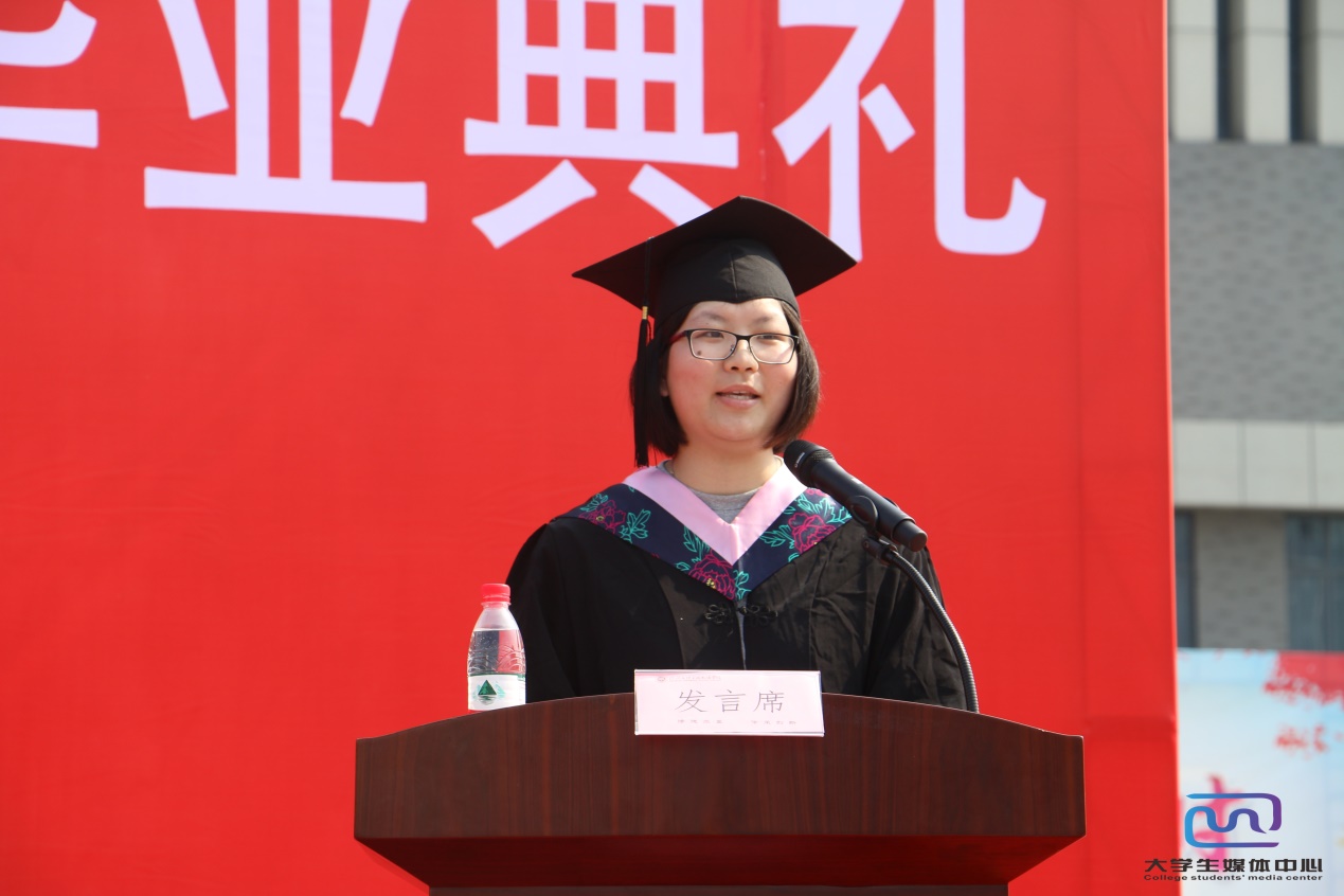 英语1401班钟栗等两位同学作为毕业生代表发言,她表达了对母校四年培养的感激之情,表示今后无论身在何方,身处何位,将不忘恩师教导,脚踏实地、学以致用、用以促学、学用相长。
