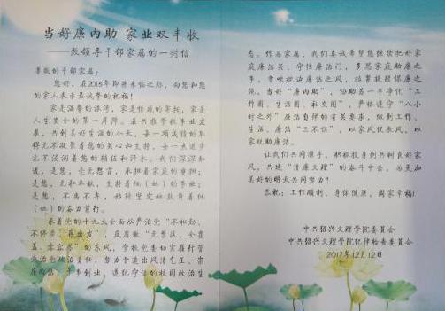 家是温馨的港湾,家是情感的寄托,家是人身安全的第一屏障。为充分发挥家庭在党风廉政建设中的独特作用,在2018年元旦前夕,学校纪委向全校中层及以上干部家属共计140余人送上了一份特殊的新年礼物——一封助廉信和一本助廉书籍。