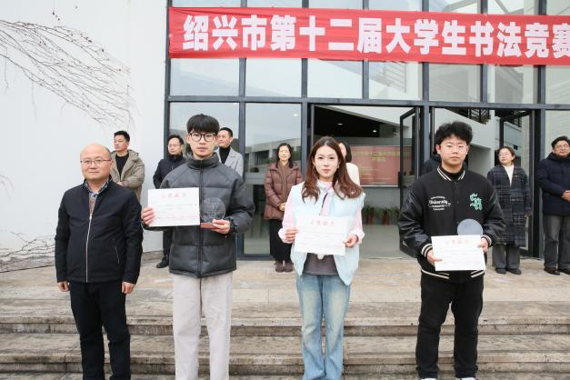 与会领导和嘉宾为绍兴市第十二届大学生书法竞赛获奖选手颁奖