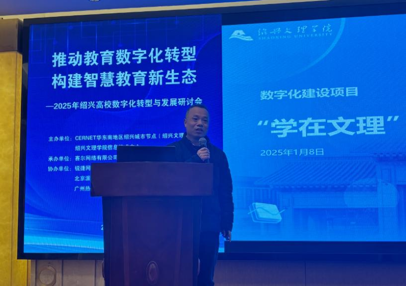 1月8日,2025绍兴高校数字化转型与发展研讨会在绍兴国际大酒店召开,我校作为中国教育和科研计算机网华东南地区绍兴城市节点,是此次会议的主办单位,赛尔网络有限公司浙江分公司为此次会议的承办单位。会议聚焦“推动教育数字化转型,构建智慧教育新生态”主题,旨在总结交流2024年绍兴高校信息化工作成果与经验,探索谋划2025年信息化相关重点工作,为绍兴高校教育数字化转型搭建经验分享与交流的平台。来自CERNET绍兴城市节点会员单位的40余位信息化专家、技术骨干及合作伙伴参会。