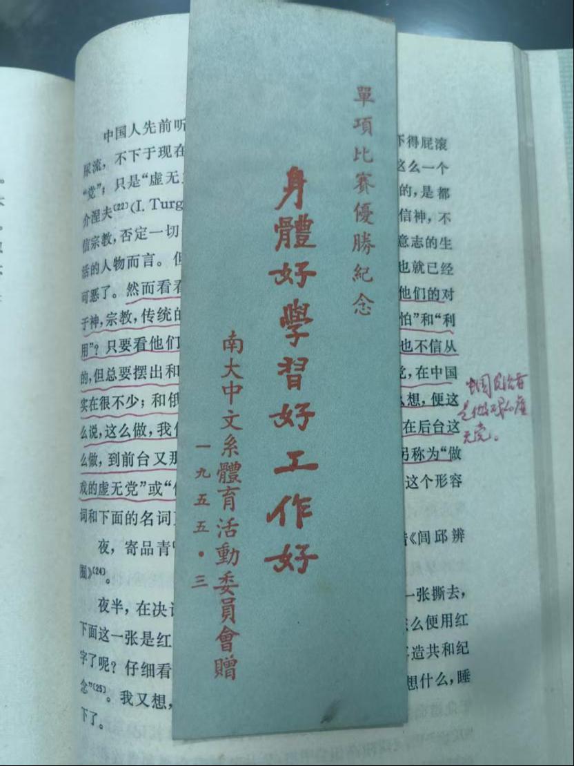 陈瑶华女士深情回忆:“这些书是爸爸生前备课的案头挚友,每本都有他的批注手记。”记者翻开其中一本书,除一页页的批注外,还惊喜地看到一张陈祖楠先生求学时的“书签”,这是70年前“南大中文系体育活动委员会”颁发给先生的奖励纪念凭证。母女俩表示,这批藏书与先生相伴一生,蕴含着先生“捧着一颗心来”的教育情怀。