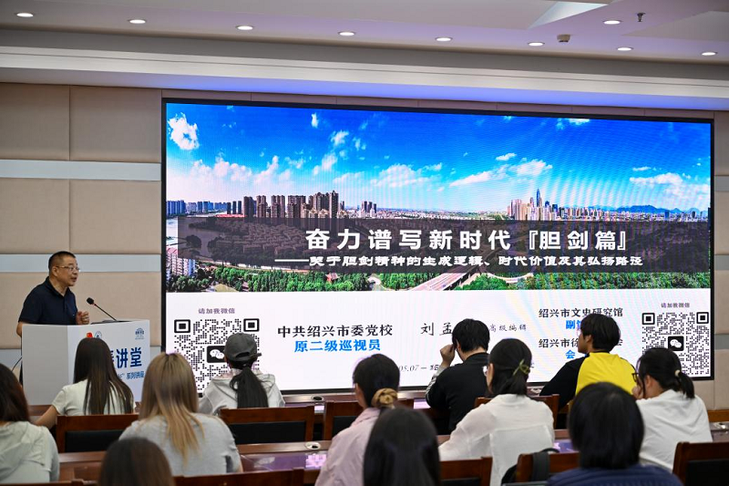 讲座伊始,刘孟达以自己发表的《越地经济文化论》《胆剑精神及其当代价值》《绍兴模式研究》等16部学术专著为引,娓娓道来胆剑精神的缘起。习近平总书记在浙江工作期间多次提到“胆剑精神”,要求绍兴谱写新时期的“胆剑篇”,这一精神成为激励绍兴发展的重要动力源泉。