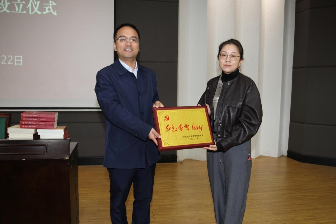 报告会前,举行了绍兴市委党史研究室“红色书架”设立仪式,绍兴市委党史研究室向兰亭书法艺术学院捐赠红色图书。绍兴市委党史研究室主任朱全红为学院“红色书架”授牌,学院党委副书记李湛接受授牌和赠书。
