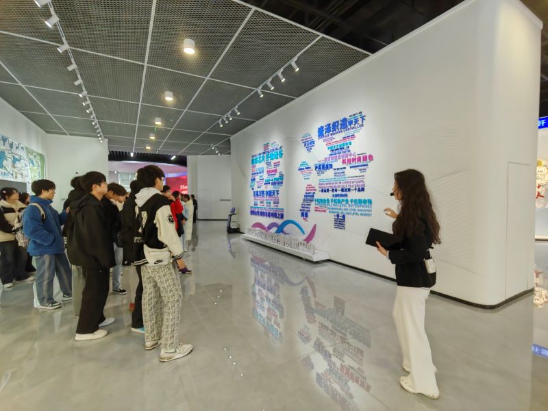 全体师生参观国家先进功能纤维创新中心展厅、公务检测服务平台、重点实验室及创新联合体。展厅内,一系列高科技功能纤维产品琳琅满目,从智能穿戴设备到高端纺织材料,无不彰显着创新中心的研发实力和市场应用潜力。讲解员为师生们详细介绍正在进行的研发项目,包括新型功能纤维的研制、性能优化以及应用领域的拓展等。师生们仔细聆听并对功能纤维的多样性和创新性表示出浓厚的兴趣。